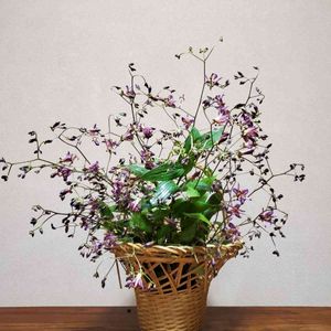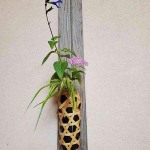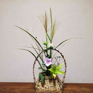 初めて長宗全籠を掛けてみました。 置くのと掛けるのでは全く見え方が違いますね。 掛けるには芒が長すぎました😅💦 雨の日に小紫を切りました。 明日まで持てば良いのですが… 枝が短すぎました😅
