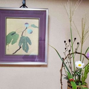 日本画大家小茂田青樹のプリント色紙 題「無花果」なら掛けるのは今でしょと思ったら なんとゴマダラカミキリ虫まで❗ ススキ2本挿すのは変ですか?