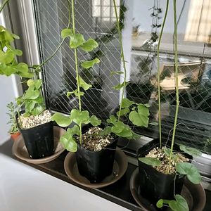 ディオスコレア エレファンティペス アフリカ亀甲竜 蔓がどんどん伸びてモッサモサになってきました😆✨ 勢いがすごく、ワイヤーが見えないほどに繁っています🌱 来年はもっと広く誘引できるようにしないと場所が足りなさそうです😳💦 基本室内の窓際に置いていますが、途中一度ハダニが発生したので 水やり時は外に出して葉にシャワー🚿しています