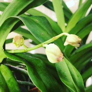 Phalaenopsis japonica(Sedirea japonica)×Vanda denisoniana) GS内で盛り上がりを見せるナゴデニちゃん(たぶん4人くらい😅) 香りのあるバンダとナゴランの交配種で、花を見るのは今回が初めて。 残念ながら今の所蕾2つ!わがやのベランダ砂漠ではいつポロリしてもおかしくないので、地味写真だけど、投稿。 蜜で、ペットリ。蕾の形は完全にデニソニアナ。色もおそらく黄色だな。ピンクが良かったけど、黄色バンダは我が家に居ないから、それもいい。まだ小さいから当分かかりそう。 と、蕾のあいだ、色々と妄想するのが楽しい。