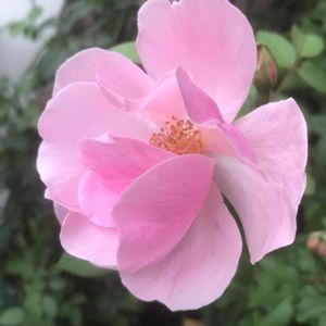 おはようございます(*^-^*) ER のつるバラ🌹 ザ・ウェッジウッド・ローズです 淡いピンク色の花で花弁の先だけギザギザが入った可愛いバラです 花首が長いので高い場所に誘引するとうつむき加減に降り注ぐ姿が見られそうです😆💕