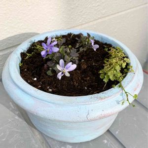 水色にペイントした鉢に小さな小さな種まきっ子碧いうさぎを二株とチドメグサを植えました。どんな風に育つかな〜