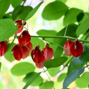 マルバデイゴ (マメ科) 南アメリカ原産で、ブラジル原産のアメリカデイゴから作られた園芸種。和名は「海紅豆(カイコウズ)」 小葉が卵形。花は赤色の蝶形花で、枝先の総状花序につきます。 卵形の小葉にセミの抜け殻見っけ👀 気温は少し下がりましたが、フラワーセンターではツクツクボウシさんたちが、終わりゆく夏を惜しむかのように 大合唱していました🎶〜🎶〜🎶 大船フラワーセンターにて撮影📷