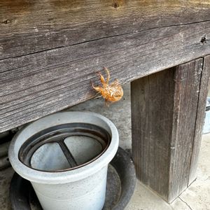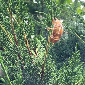 おはようございます。曇り、22.1℃、9:10ちょうどいい。朝のゴミ捨て帰りに庭のコノテガシワの木を見たらセミの抜け殻が、、幼虫は狭い庭のどこで生きていたのだろうかね〜😻🥰😍🤗😊😸