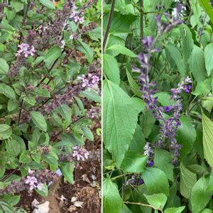 7月、もう後半。ここは、今年は梅雨が早めに明けたようだ。夏が強く感ぜられる時期に入る。私の散歩道の道際等の草花達は、徐々に、夏の強い陽を浴びて、バラエティのある色彩を表出しようしているようだ--- 6月からの、熱い夏に向けての準備に忙しそうな草花達---その18。 オープンガーデンにみる、バジルとセージ類の草花2つ。 ---梅雨明けの少し前の、何時ものオープンガーデン。 そこには、同じような容姿を持って、少しの距離を置いても、何か早くにあの夏の陽を乞うように、2つの草花が連携しているかのようだった。 ホーリーバジルと、ラベンダー・セージ。 前者は、ピザやパスタなどのイタリア料理に欠かせないスイートバジルより香りが強いという、また葉を毎日食べれば医者いらずという国(タイ国)もあるというハーブのひとつ。 後者は、2種のサルビア類の交雑による花穂の様子が、ラベンダーに似ていることからその名が付いたという。 ・ホーリーバジル<別名 トゥルシー>(シソ科 メボウキ属) ネパール、インド、オーストラリア原産地とする多年草ないし一年草。 ホーリーバジルの別名・トゥルシーは、サンスクリット語で「比類なきもの」を意味し、5000年以上前から聖なる植物として人々に崇められてきた歴史のある植物。 インドの伝統医学・アーユルヴェーダでは「不老不死の霊薬」とされている。 ピザやパスタなどイタリア料理には欠かせない「スイートバジル」である。バジルは交配しやすい植物で、世界中に150種類以上あるが、全種類が食用可能であり、その中の1つ、ホーリーバジル。 ピザやパスタに使われるスイートバジルと比べると、ホーリーバジルは、強い香りとスパイシーな風味が特徴。食べられる部分は、葉・茎・種子。 生葉なら両手いっぱいくらいの葉を集めて、200ccほどの熱湯を注げば、スパイシーな香りがいっぱいに広がるハーブティーに。 ただ、ホーリーバジルだけでは飲みにくいので、ミントやレモングラス、スギナや緑茶を半分ほど混ぜるとよい。 タイでは、ホーリーバジルは古くから薬として知られていて、葉を毎日食べれば医者いらずということわざも。 「死神を寄せ付けない植物」ともいわれ、各家庭に植えてあり、生活に密着した植物のようである。 タイでは気温が下がらないため多年草となるが、日本では冬の寒さに当たると枯れてしまうため、一年草として扱われる。 ホーリーバジルの栽培は、4~6月に種まきをしたり苗を植え、夏から晩秋まで葉が繁ってその間ずっと収穫が楽しめる。 開花期は7~10月で、11月末には終わりを迎える(関東の場合)。 ホーリーバジルの持つ強い香りは、脳を刺激し、免疫機能を高める作用や、消化を促進する作用がある。 また、葉の緑色にはβ-カロテンが多く含まれていることから、抗酸化作用も期待できる。 また、ストレスを軽減させる作用、発汗作用などもあるハーブであり、ハーブティーとして、1日1杯を続けて飲むと日々のストレスケアや冷え性予防・風邪予防など、体質改善にもなる。 (出典・参考; GARDEN STORY) ・ラベンダー・セージ<別名 サルビア・インディゴスパイア>(シソ科 サルビア属) ブルーセージ(サルビア・ファリナケア)とサルビア・ロンギスピカとの人工交雑種。 カリフォルニア植物園で作出された。 花穂の様子がラベンダーに似ていることからラベンダーセージと呼ばれる。 学名からサルビア・インディゴスパイアとする場合もある。 長い花穂が伸びて濃紺の花が咲く。葉は卵形で、向かい合って生える(対生)。 花期は6月〜11月。 (出典・参考; みんなの花図鑑)