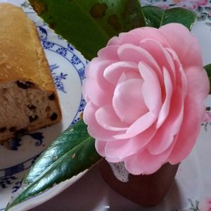 レーズン🍞が焼けました! 早速試食したら、焼き立てはふかふかで美味しい😋 乙女椿が横で 欲しそうに見つめてる👀
