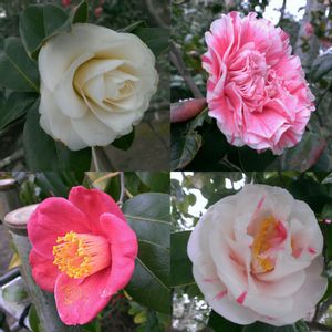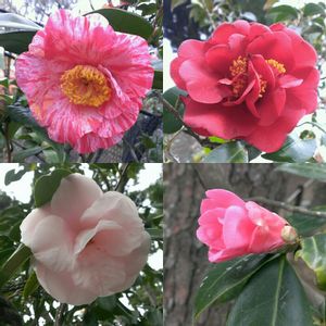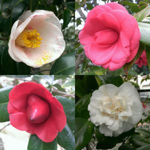 椿庭園へ行ってきました。 シリーズ④ 右上から時計回りに マソティアナ・ルブラ、しろぼくはん、こんろんこく、、てんにんつばき。