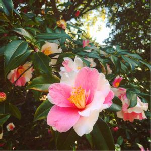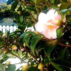 朝陽を浴びてる 可愛い 乙女椿を探したら あんなに高い所に💗 雲まで届け⤴ ( ^^)/元気を出さなくちゃ🙋