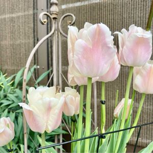 無事に開花したチューリップ アプリコットプライド はじめて育てた品種ですが、アプリコット×クリームの花色が可愛いすぎる〜🥰 定番のアプリコットビューティーよりも優しいパステル調の花色です 今年のチューリップは花茎が曲がって折れるので支柱を立てて凌いでいますが、この花色はとっても気に入りました🫶 来シーズンも育てたいです✨