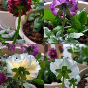 ①ビオラちゃんこっち向いて~😆 1シャルロット 2ティアード 3シエルブリエ 4恋みやび 後ろ姿でご免なさい🤭 ②前からはこちら😆 ③花日和オリジナル ティアード 我が家に来て初めて咲いてくれました😊