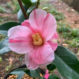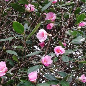 ピンクのおちょぼ口を開いたような可愛らしい椿‥ ここは30m(多分)くらいピンクの花をつけた椿の木が続き初めて見た時はビックリ😱 この頃は伐採して本数は大分少なくなりましたが咲くとずうっとピンク色が続きます‥