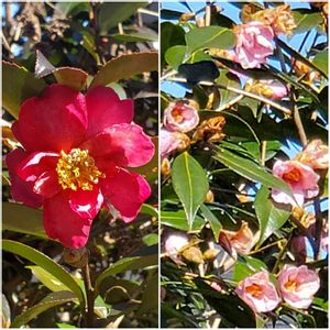 今日の庭 上段 今季2度目の登場 左 侘助椿 右 昭和の栄サザンカ 下段 白いサザンカも 咲き始めました💠