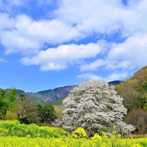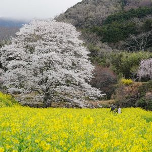 おはようございます☺️ 秦野市蓑毛の「淡墨桜」🌸 菜の花畑に凛と立つ一本桜です