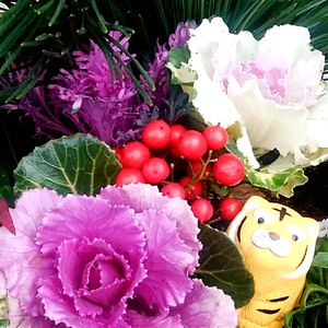 *ハボタン(葉牡丹) 明けましておめでとうございます🐦 寅ちゃんが、微笑みを添えてくれました🐯 2022年もよろしくお願いします💕 花言葉…愛を包む