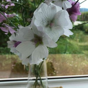 ムスクマロウ 白とピンク ピンク好きのジャスミンですが ムスクマロウは白が好き♡ ピンクのシベが可愛いの〜💓 可愛いけど 雑草のような繁殖力で増え続ける~😆