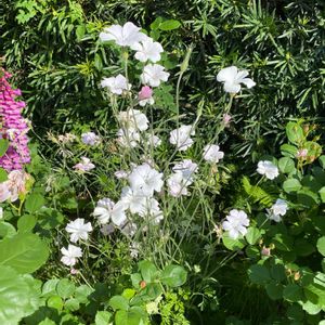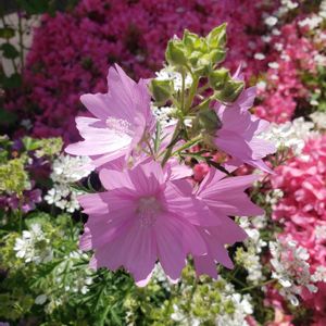 白いお花たち🤍 1.ムスクマロウ ほんのり香りがします̋ ੯ꔷ̀͡ᓑ\クンクン 麝香の香りらしいです🫧🫧 2.イベリスが少し咲いてます🕊 3.銀盃草 過酷な場所に咲いてます(˶ˊᵕˋ˵) 強い💪