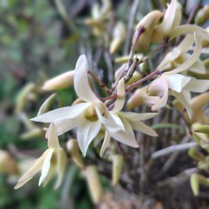 『セッコク(石斛)』 日本の中部以南に分布し岩上や大木に着生する、ランの1種です。江戸時代から栽培された古典園芸植物として、長生蘭とも呼ばれます。
