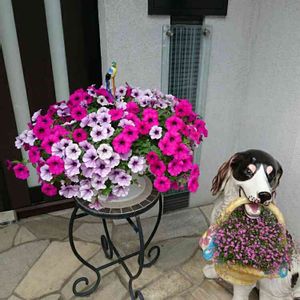 サフィニア2色植えが花数多くなったので門扉前に移動~。 家の前を通る方も立ち止まって見て頂いています。 『幸せを呼ぶ青い鳥』と母が飾って下さいました。