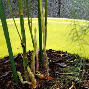 2020年6月7日(日) 顔を出したアスパラガス。 狭いところに密状態(笑) プランターの株を1ヶ月程前に株分けし 別のプランターに植えました。