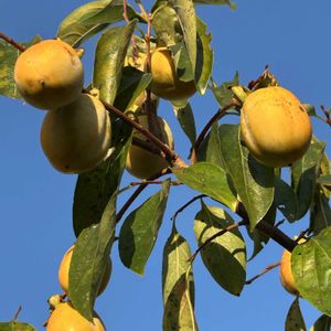 おはようございます♬ 七月二十一日にアップの柿 ようやく色付いてきました これは渋柿でも今年は豊作 柿の花言葉は 「優美」「自然美」「恩恵」「恵み」 花言葉モノローグです 隔年結果という言葉の通りに 昨年は不作でも今年は豊作で 剪定や施肥しない地植えの柿 よくしたもので二年毎の収穫 代わりといえば身も蓋もなく 艶と大粒で答える優れ物です 自然の造形は実の括れまでも 優しく美しいと感じています 残念な事に一番に恩恵を受け 北叟笑むのは烏の勘太郎です 天辺の熟柿を独り占めしては タネとヘタを撒き散らします 腹いせに透明テグス糸などを 張り巡らして懲らしめようと 画策はしますがいつも頓挫で 私は悔しい思いをしています アイツ名が悪い枯らすだもん