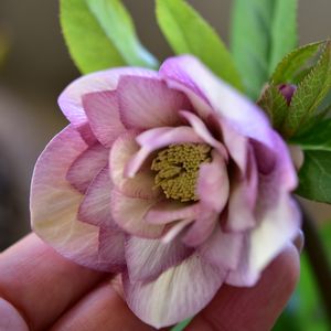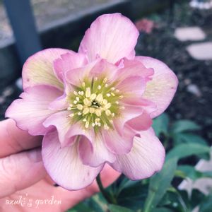 ダブルのクリスマスローズの1番花 前かがみの茎に下を向いて咲いていて どうやっても撮りにくい 美人さんなのに~ あちこち場所を移したり 角度を変えたりしたけどやっぱりキレイに撮れない 結局上向かせてパチリ