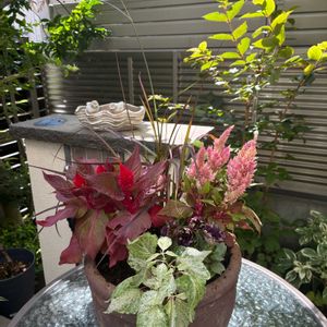 久しぶりに寄せ植えつくりました𓂃𓂂ꕤ*.゚ 昨日はグリーンホビーに行き、秋らしい植物買ってきました。(②③枚目) 昨日買ったセロシア2種とプッチーノプルーンに、夏に買ったパープルファウンテングラスを株分けして入れて、水にさして発根していたアルテルナンテラ、溢れ種から育っていたジュズサンゴ絣を入れましたよ😊 今日の午前中は日差しも強くなくて、作業しやすくて良かった。 暑い日ばかりだけど、秋も少しずつ近づいてるのかな? お花の寄せ植えや投稿、久しぶりな気が。 8月は観劇が多かったことや、暑かったこともあるけど、力を入れていた野菜が収穫間際にネズミか虫の被害にあり、やる気を削がれてました。 これからどうしようかと考え中💦 でも、再スタートきらないとね。