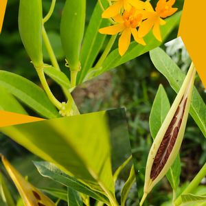🌸アスクレピアスの花と 種のさやと 並んだ綿毛と 飛び立った後😘 昨日、種のさやが開いて お行儀良く並んだ綿毛が見えてたのよ! 今朝見たら、飛び立った後で😅もぬけの殻! どこに飛んでったの〜? 皆さんの所まで行ったのかなー🤭