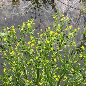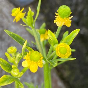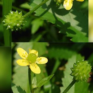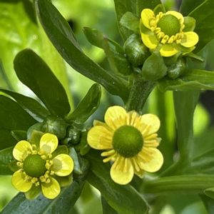 散歩の途中🚶♂️ 水田や用水路に生える雑草、有毒植物🤣 花弁は5枚で花径4-8㎜ほど、黄緑色で光沢があります🤔大きな球形の果実がユニークな印象です🥰 5月18日投稿のケキツネノボタン(4月30日撮影)に似ていますが、果実が楕円に大きく膨らむのが特徴です🤗 5月2日撮影 キンポウゲ科キンポウゲ属 水生植物 一年草又は越年草 田辛子 原産地:日本在来種 開花期:4-5月