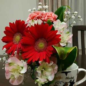 先月の19日に投稿の花です💐 二週間経ってて美しさ保ってます✨ ガーベラ 花もち良いですね💕 スプレーカーネーション変化なし💕 アルストロメリア蕾だったのが開き見ごろ💕 かすみ草いい!💕 スヌーピーのマグカップとコラボして🎵