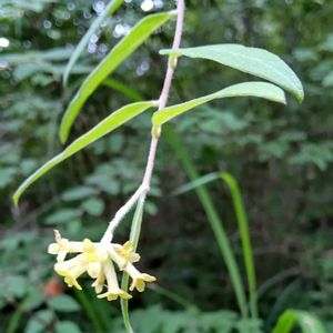 ササユリの咲く場所には「はじめまして」の花がいっぱい💕 この花は枝の先だけに花がついてて変わってるね 「ガンピ」だと判りました(^O^) 「コウゾ」「ミツマタ」と同じ紙の原料になってたそう 高さもなく細い枝から取れる繊維は少ないだろうに、昔の人の知恵と工夫に驚きます