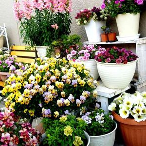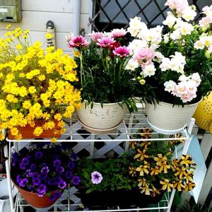 白いラックも最近お花配置かえました🎶 イエローのダールベルクデージーさんが2年目の満開に🎵 ガザニアさんは晴れないと開かないけどシュッとした姿が大好きな花🤤 八重咲き金魚草トウィニーはウットリ眺めちゃいます🙊2年目株🎶 カリブラや冬越ペチュニアさんもいます🎵