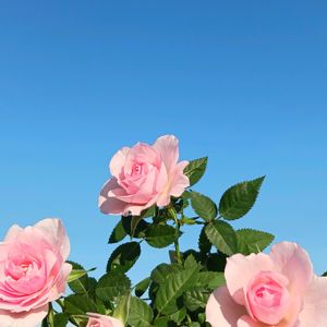 ミニバラと青い空 気持ちがいい朝です。 土曜はお空の発表会、参加します。