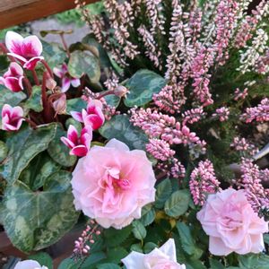 ベランダのピンクのお花達 カルーナ ミニバラ シクラメン