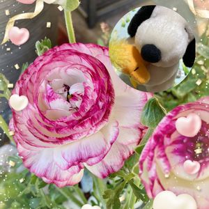こんばんは 今夜の2枚目 仕事帰りに立ち寄った店先のラナンキュラスさん 濃いめピンクの縁取りが可愛い💓 スヌーピーちゃんとウッドストックを入れ込みました♪ 🏷毎月2日はスヌーピーの日