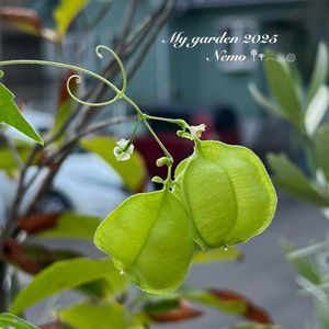 小さな庭のこぼれ種から風船かずらの小さな花が咲き 可愛いグリーンの風船ができました🎈💕