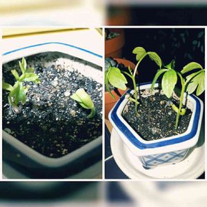 左が風船カズラ 右が黒ほおずき 発芽しました❗夕方の水やりに発見(^-^)v 種蒔きからの早い発芽にビックリです(*_*)