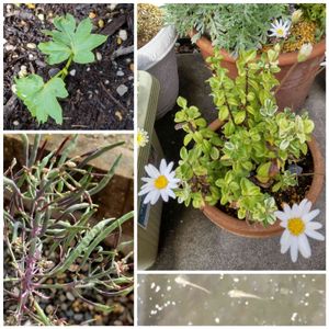 ・風船かずら→次女ちゃんが秋だったか冬だったか学校から持ち帰ってきて、種まきしたもの。ようやく芽が出ました😳 ・葉牡丹→種が出来た??😳 ・ブルーデージー→ホムセンで苗を買って植えたのはいつだったか??一年は経過しているはず。ちっとも花が咲かないし、斑入りだったのに斑入りじゃなくなったし、変化がない😡けど、枯れたわけではない、、と捨てずに水やりしていました。やっと花が咲きました😳斑も少しだけありました😳 〈金魚の日記〉 あれこれお世話をしていた室内飼育の稚魚は、とうとう全滅しました。保険的に屋外でも育てていた(放置に近い)稚魚は生きています。朝一度、粉末の餌をあげるだけで、手間はかけていません。太陽☀のパワーと、自然にわいた苔と、白い虫(蚊?か何かの幼虫?)を食べているのかも。 フリマアプリでゾウリムシを買ったから、それも挑戦😁
