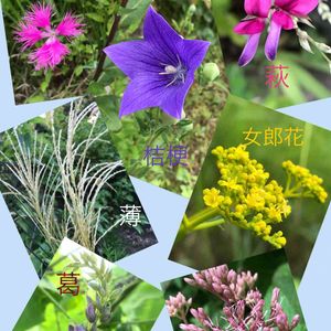 『秋の七草』 ①女郎花 オミナエシ ②薄 ススキ ③桔梗 キキョウ ④撫子 ナデシコ ⑤藤袴 フジバカマ ⑥葛 クズ ⑦萩 ハギ