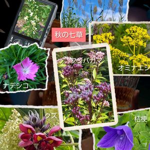おはようございます😃 秋の七草を集めてみました。萩 桔梗 尾花 撫子 女郎花 葛 藤袴。 藤袴はセイヨウ藤袴です。