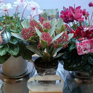 🎍明けましておめでとうございます🎍 本年も我が家の🌱🌿🌸🌼🌴🍃🍀たちの為、精進致しますよぉ~😆✨ スキミヤ→ミヤマシキミ 雄花なので実はなりませんが億両ということにしてください😁 水槽光浴でお正月気分を演出です🎍 冬桜とスキミヤは矢祭園芸さんの直売会でお迎えしたものです🎵