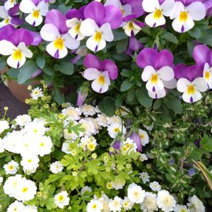おはようございます。 ビオラとフランス小菊(マトリカリア)🤍💜🤍😙 去年の10月18日に投稿してから、フランス小菊🤍だいぶワサワサになりました。 ビオラもまだまだ元気です。🤗