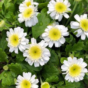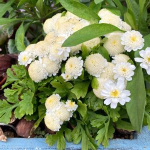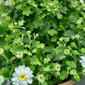 【 フランス小菊 マトリカリア 】 キク科 耐寒性多年草 最近のキク科は種類も多く、可愛いらしいものが多い😊赤玉土を買いに行って、またも一目惚れ🎵 キク科なので、さっそく挿し芽にチャレンジ❗️ HCバロー 145円