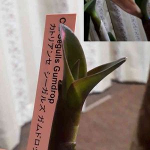カトリアンセ~🎵 シーガールズ・ガムドロップ 今年の東京ドーム蘭展で購入✨ 2本の新芽が大きくなってシースが~🎵 でも1本のシースの色が〰😱 これは枯れてる(・_・?) 中に蕾はありますが、無事に咲いてくれるでしょうか〰😥