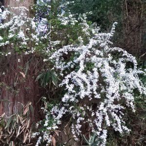 おはようございます! 我が家のユキヤナギ ほんとうに、雪のよう! 枯れ笹とともに😆