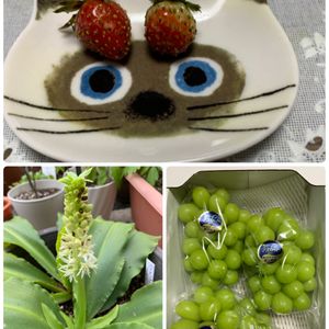 🍓こんにちは🍓 連日昼間は夏のような暑さ💦💦ですね。 小さな四季なり苺🍓🍓が2個なっていました😍 パイナップルリリー🍍の成長が早くてびっくりです。 🍍が顔を出して2週間で花、種まで😆 岡山のお友達から高級なシャインマスカットが届きました😍😍😍 私は大好きなんですが、主人は皮を食べるのがあまり好きじゃないみたいです😆 無理して食べなくてもいいよ〜ラッキー🤣🤣🤣 お礼に丹波篠山の黒枝豆を送ります😊 地域の特産品を頂けて嬉しいです🍇 シャインマスカットで気分は⤴️⤴️ 頑張って庭片付けます💪