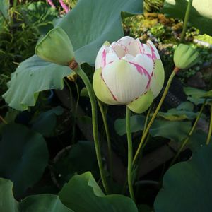 おはようございます🌄 今日のお花、ハス🤍🍀😊 一天四海(いってんしかい) 花色はやや黄色味のある白色の緑に紫紅色の不規則な帯状の紋が入る斑蓮。 花弁の表と裏では紋の形が異なっています。 一天四海とは、全世界を意味する「一天四海妙法に帰す」という仏典の言葉に由来します。 岡山藩主池田光政が好んだ品種で「大名蓮」とも呼ばれています。 今日も、体調にはお気をつけて、穏やかな一日をお過ごしください😊 🏷白い水曜日♡ 🏷水辺の水曜日 🏷花咲く乙女たち♡