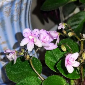 白色系のミニセントポーリアが仲よく3つ咲いています。🩷 手前からうちのNo.24、25、3。 昨日の札幌はみぞれ❄️最低気温2℃最高気温7℃と一気に冬到来です。でも室内は暖かいからセントポーリアたちにとっては、夏よりずっと快適。続々と開花しています。