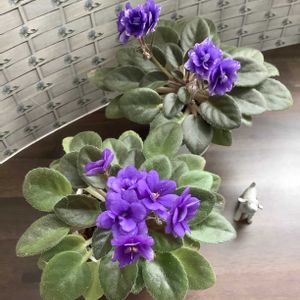私のセントポーリアNo.18🩷 久々の開花です。青に白いエッジが特徴だったのですが、今回はほとんど白い部分がないみたい。