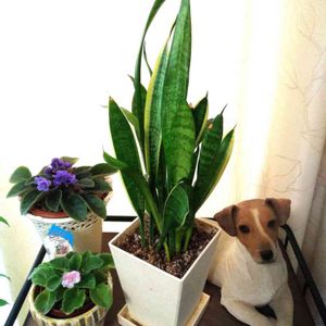 ずーと水栽培になってた小サンスペリアを集め、ようやく鉢に植えました🎶 ミニセントポーリアとワンちゃんと一緒❣️