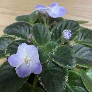 昨年のお盆に、花が終わっておつとめ品にされていたのを連れて帰ってきたミニセントポーリア。 自分に育てられるか試すにはちょうどいいか、と思って買ってみましたが、どんどん葉が増え斑が入り、花も咲いてくれました。 隣のトマホークも、前回の開花から1カ月くらい休んでまた咲いてくれています。 強い子たちです。